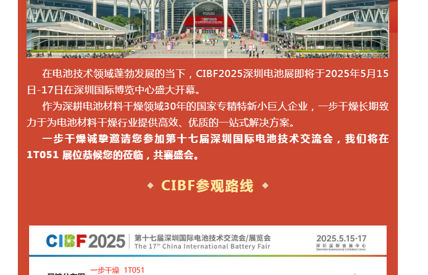 在电池技术领域蓬勃发展的当下,CIBF2025深圳电池展即将于2025年5月15日-17日在深圳国际博览中心盛大开幕。作为深耕电池材料干燥领域30年的国家专精特新小巨人企业,一步干燥长期致力于为电池材料干燥行业提供高效、优质的一站式解决方案。一步干燥诚挚邀请您参加第十七届深圳国际电池技术交流会,我们将在 1T051 展位恭候您的莅临,共襄盛会。