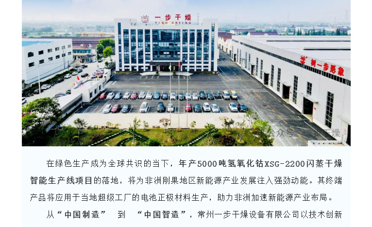 当创新浪潮席卷全球工业领域,中国智造正以势不可挡的姿态勇立潮头。近日,国家专精特新小巨人企业——常州一步干燥设备有限公司自主研发的年产5000吨氢氧化钴 XSG-2200 闪蒸干燥智能生产线项目落地非洲刚果,不仅承载着 “一步智造” 的创新成果,更开启了中国干燥技术赋能非洲新能源产业升级的新篇章。