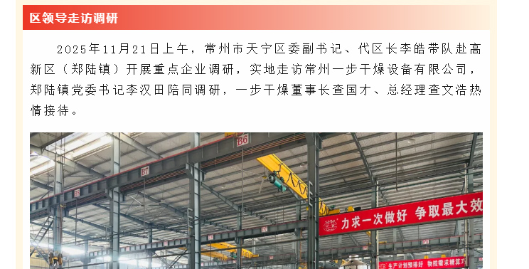 2025年11月21日上午,常州市天宁区委副书记、代区长李皓带队赴高新区(郑陆镇)开展重点企业调研,实地走访常州一步干燥设备有限公…