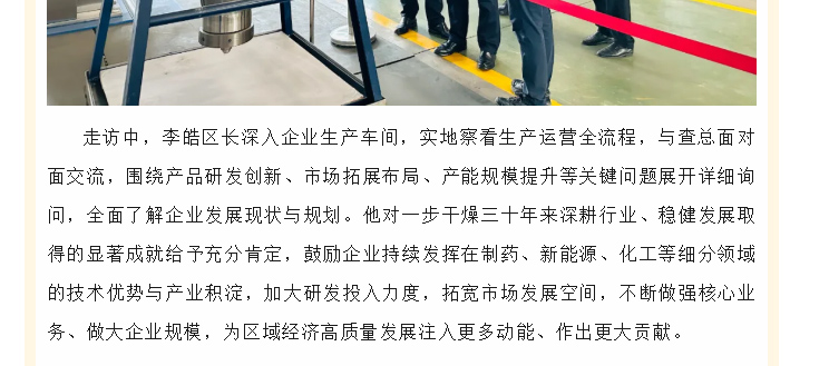 2025年11月21日上午,常州市天宁区委副书记、代区长李皓带队赴高新区(郑陆镇)开展重点企业调研,实地走访常州一步干燥设备有限公司,郑陆镇党委书记李汉田陪同调研,一步干燥董事长查国才、总经理查文浩热情接待。