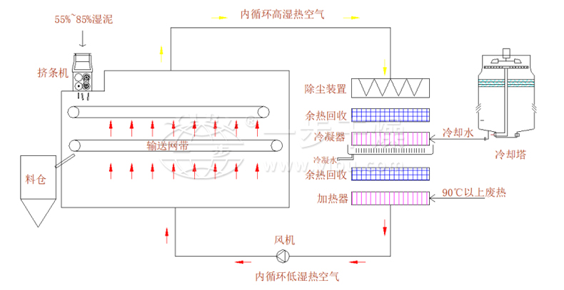 污泥经过叠螺机、板框压滤机等机械脱水后,含水率55%~85%的污泥进入干燥机顶部的挤条机,切条成型后落入干燥机内部的传动网带上,利用低压蒸汽、蒸汽冷凝水等废热,进入加热器,由循环风机将经过加热器的低湿热风从网带底部进入,从下往上穿过网带上的污泥,带走污泥中的水分,带有大量水蒸气的高湿空气从网带顶部,利用余热回收换热器将高湿空气进行一级降温,然后用冷凝器进行二级降温,使得其中水蒸气得以冷凝排出,再利用余热回收换热器对冷干空气进行一级加热,加热器对其进行二级加热,送回干燥室内;本设备可利用90℃以上的所有余热,包括低温蒸汽、蒸汽冷凝水等。